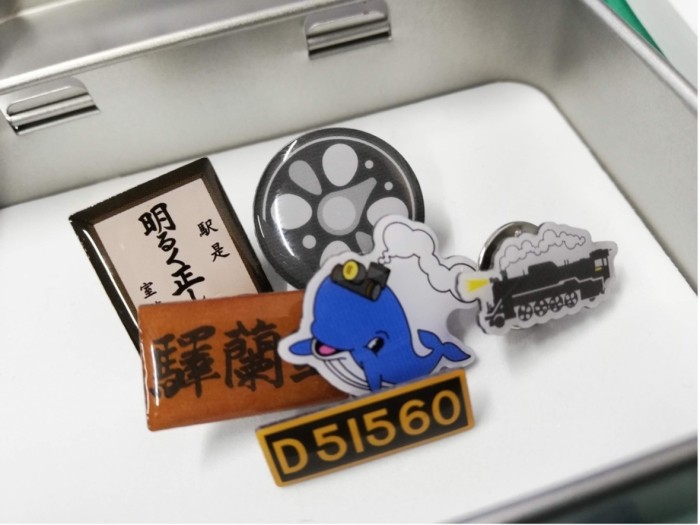 地域おこし協力隊時代。 デザイナーとしてのセンスを発揮した、旧室蘭駅舎設置のガチャガチャ用ピンズ制作。